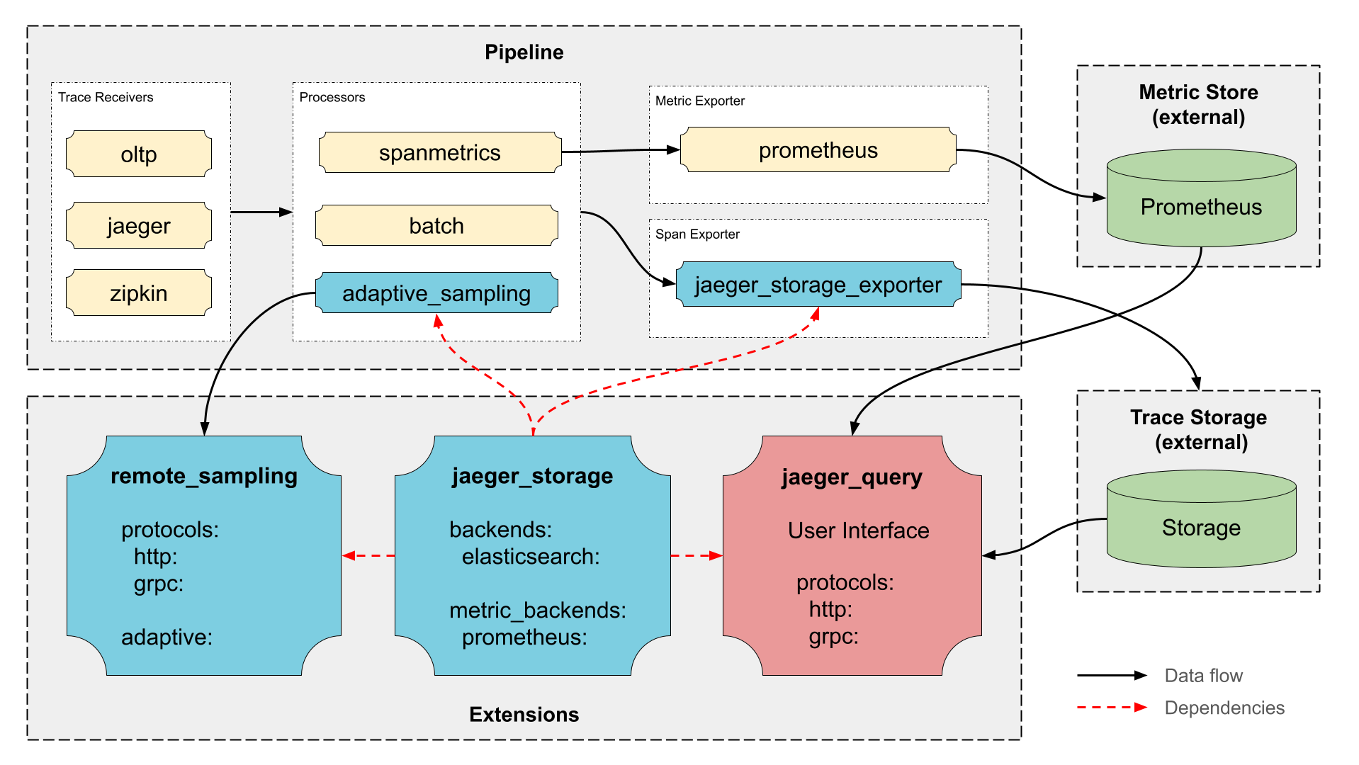 • Jaeger own components, such as Jaeger Storage Exporter, Jaeger Query Extension, etc.