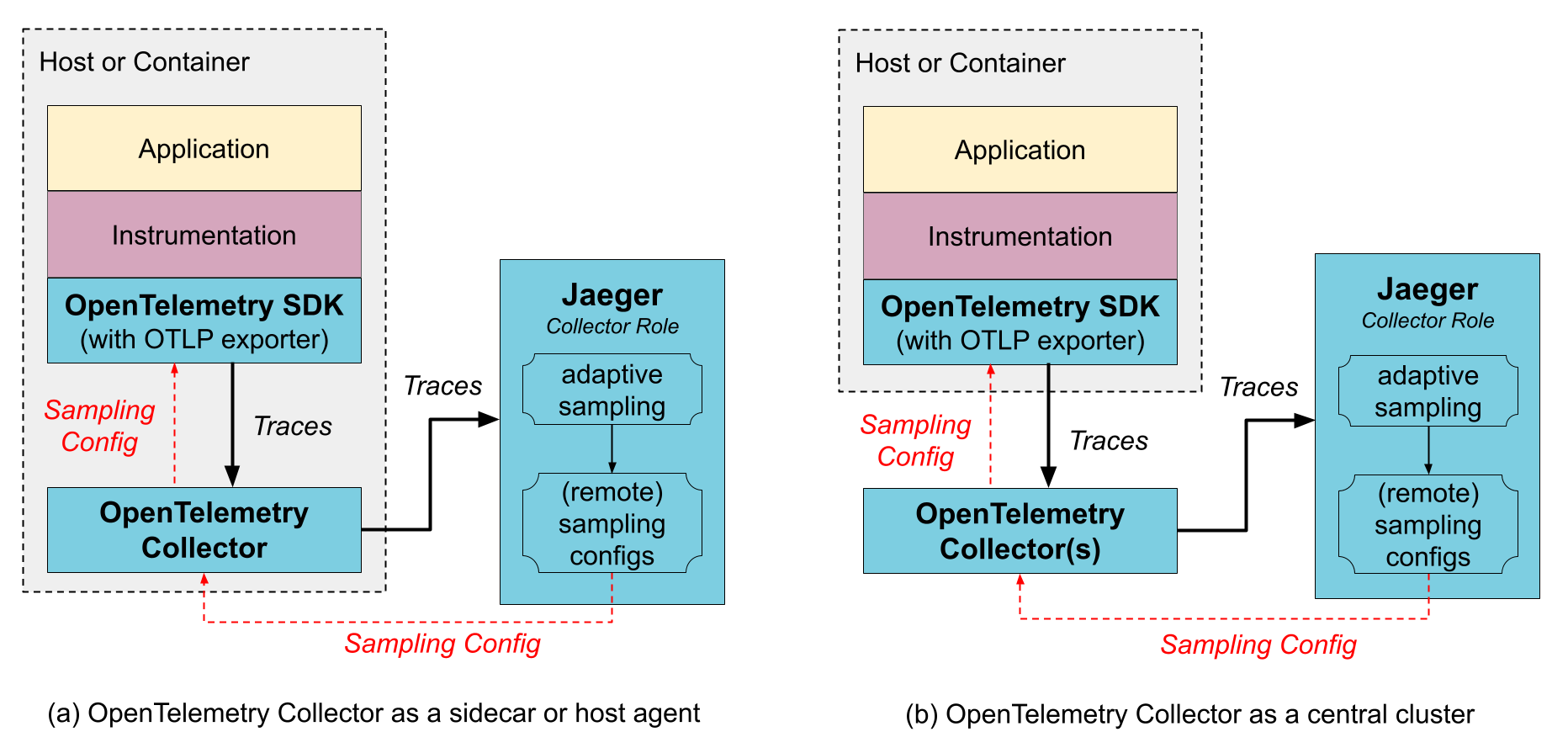 The OpenTelemetry Collector supports Jaeger’s Remote Sampling protocol and can either serve static configurations from config files directly, or proxy the requests to the Jaeger backend (e.g., when using adaptive sampling).